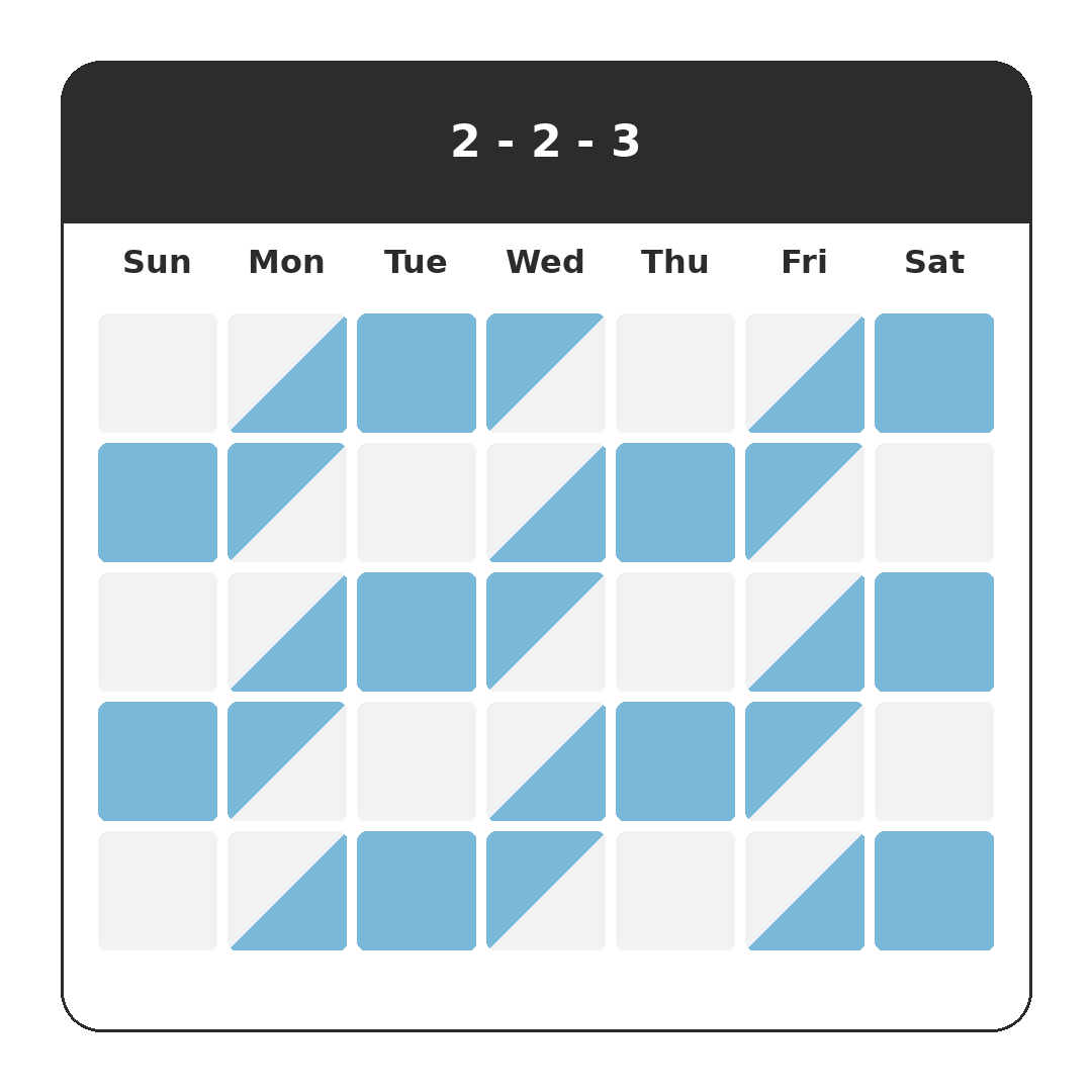 Under a 2-2-3 schedule, the children spend two days with one parent, two days with the other, and then three days with the first parent. The following week the pattern reverses. This results in a 50/50 split over two weeks.