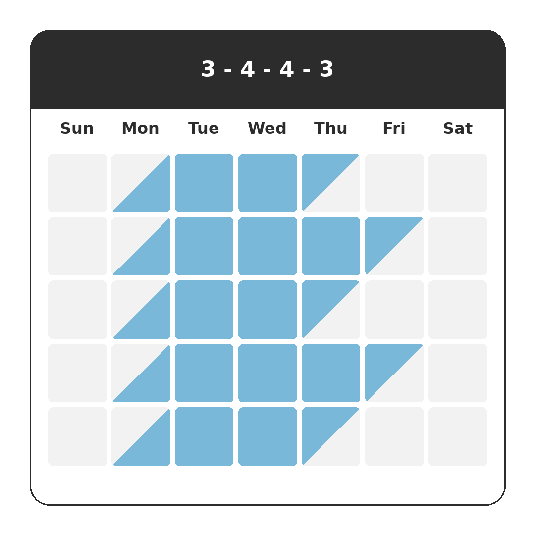 Under a 3-4-4-3 schedule, the children spend three days with one parent, four days with the other, then four days back with the first parent, and three days with the second. This also results in a 50/50 split over two weeks.